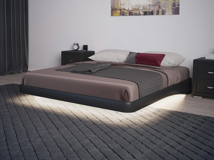 Подсветка работает от розетки — питание осуществляется через сетевой шнур с выключателем. Напряжение составляет 12 В, что делает систему безопасной и энергоэффективной. Мягкий тёплый свет создаёт уютную атмосферу и подчёркивает эффект «парения» кровати над полом.